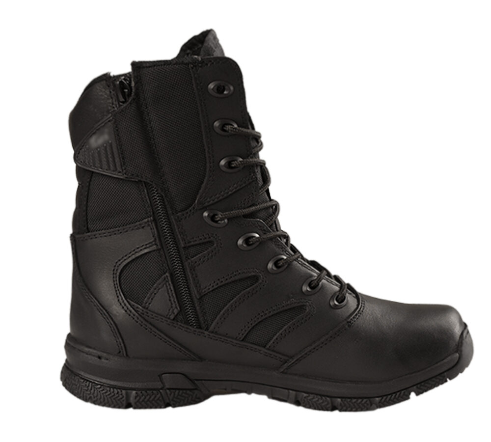 Bota Patagonia Negra, elaborada en cuero liso, lona impermeable de alta durabilidad, suela liviana en poliuretano resistente y antideslizante, vulcanizada, medidas caña de 20 cm, acolchado interno térmico suave en poliéster, cremallera lateral y plantilla resistente y suave.