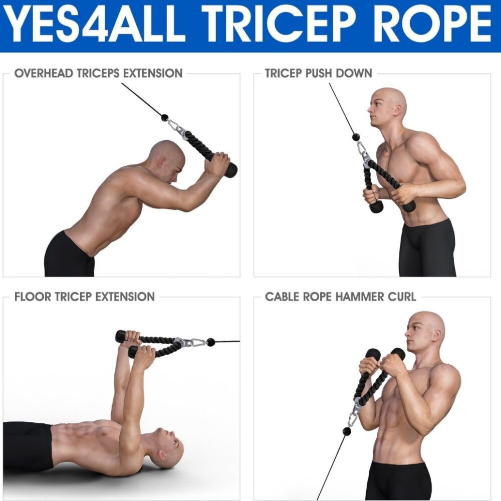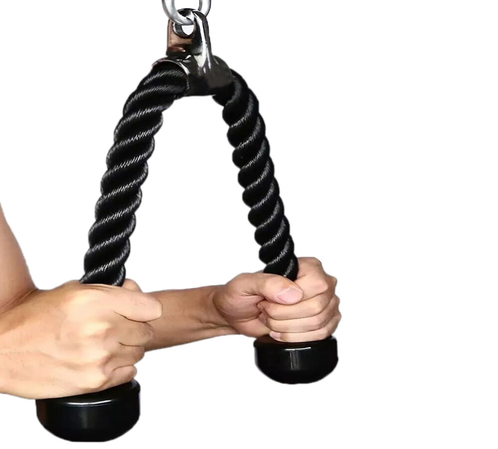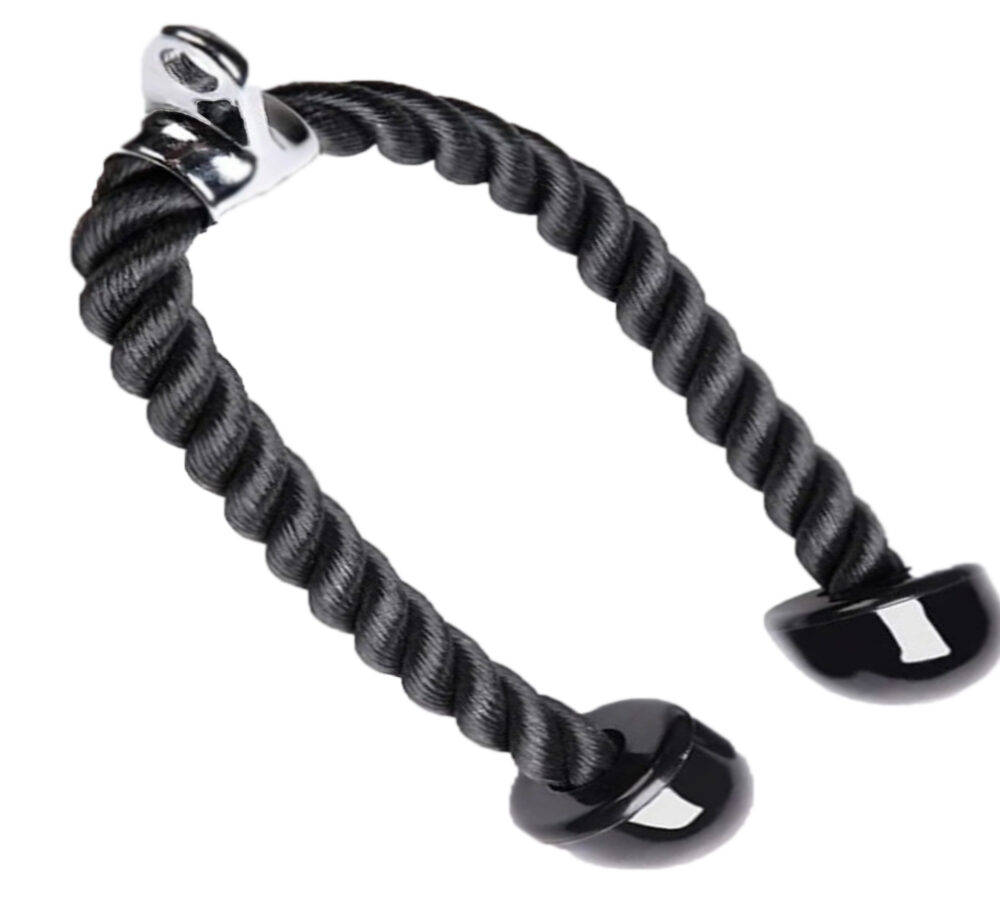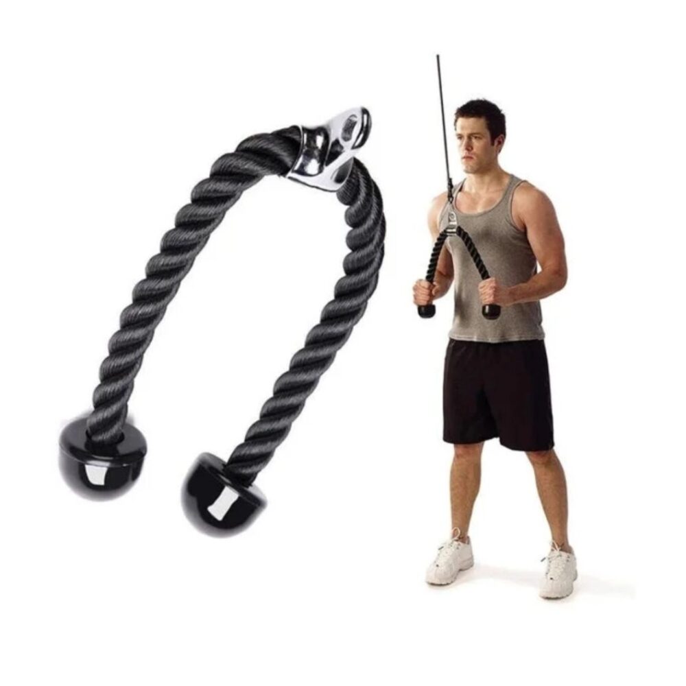 Adaptación cuerda para Tríceps. Elaborada en Nylon trenzado de alta resistencia con extremos en caucho inyectado con agarre antideslizante y argolla en hierro de fácil anclaje a todo tipo de polea, compatible con máquinas de sistema de polea.