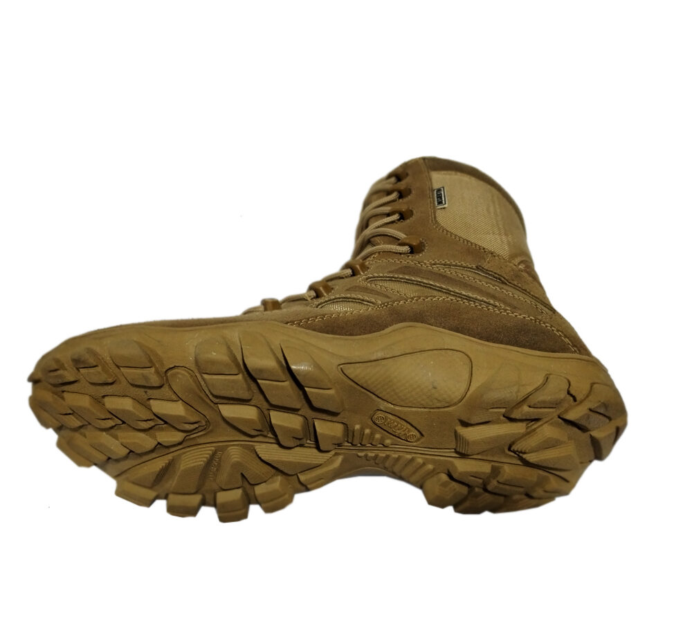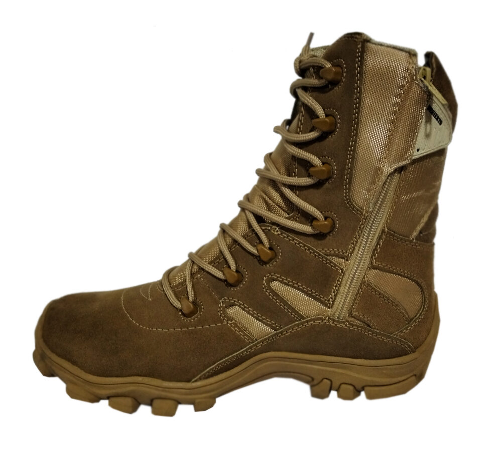 Bota Sahara Coyote, elaborada en cuero gamuzado 1A, lona impermeable de alta durabilidad, suela liviana en caucho resistente y antideslizante, vulcanizadas, caña de 20 cm, acolchado interno térmico suave, cremallera lateral y plantilla suave y resistente.
