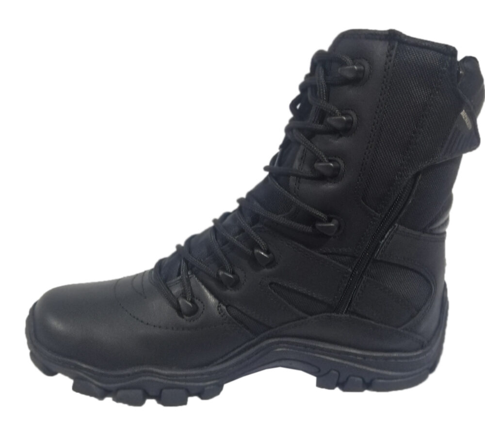Botas Tácticas Performance Referencia: Sahara, fabricadas en cuero liso y lona impermeable de alta resistencia, suela en caucho antideslizante, plantilla interior semi ortopédica, cordoneras cocidas y en inyección TPU, forro interior en lycra y cremallera lateral, peso aproximado 1.107 gramos por par según talla.
