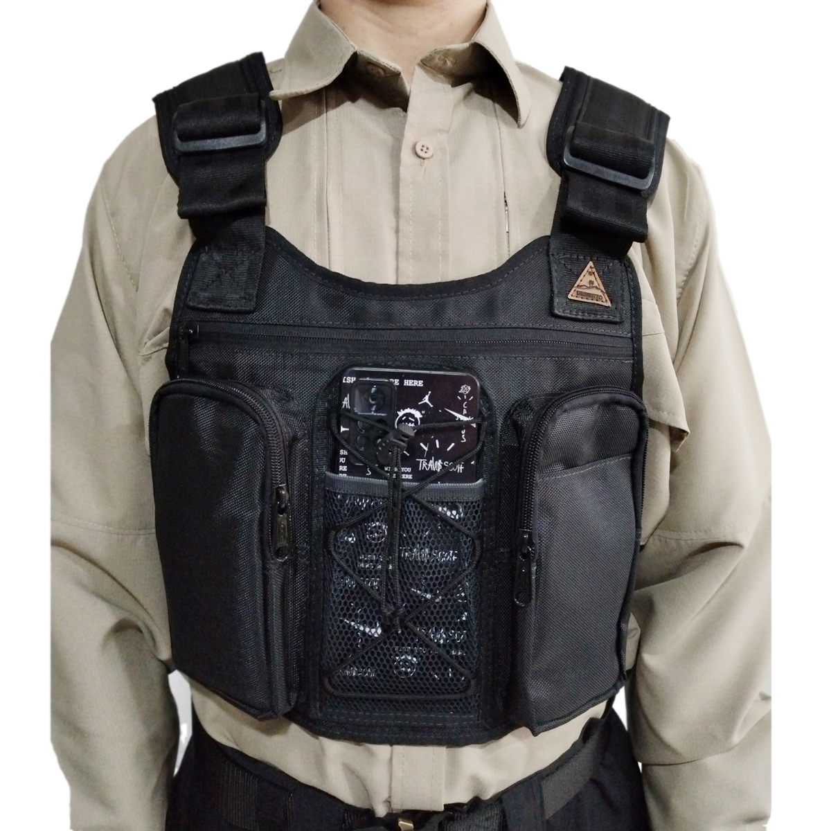 2 bolsillos verticales frontales con cremallera y un compartimento en el centro ajustable para portar celular en modo grabación