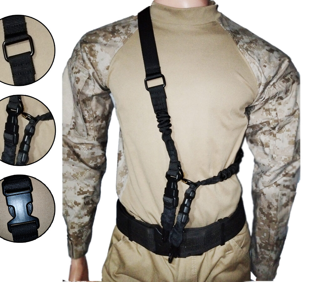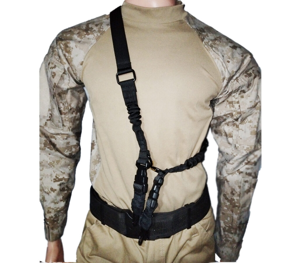 Porta fusil o correa táctico eslinga, elaborado en reata resistente y resortado, ideal para sujetar armas o cualquier otro elemento. Multiusos de dos puntos.